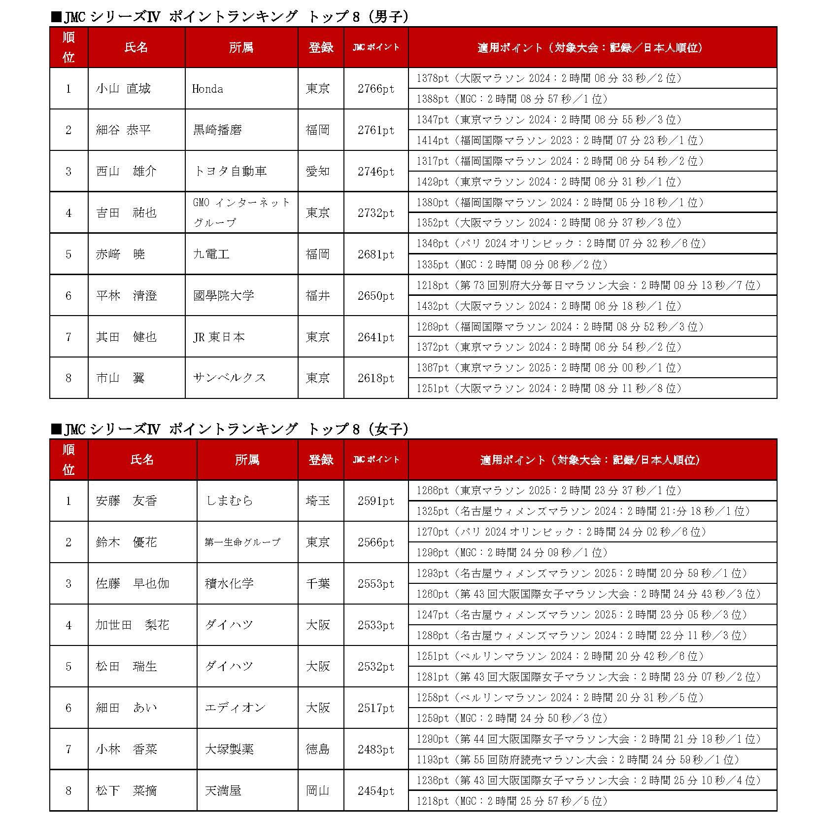 「JMCシリーズ」は、選手強化とマラソン界の活性化を目指し、国内における公認マラソン大会の体系化を図ることを目的とした仕組みで、本年最後の期となる4期目およびシリーズⅣが終了し、シリーズⅣポイントランキングが決定しました。